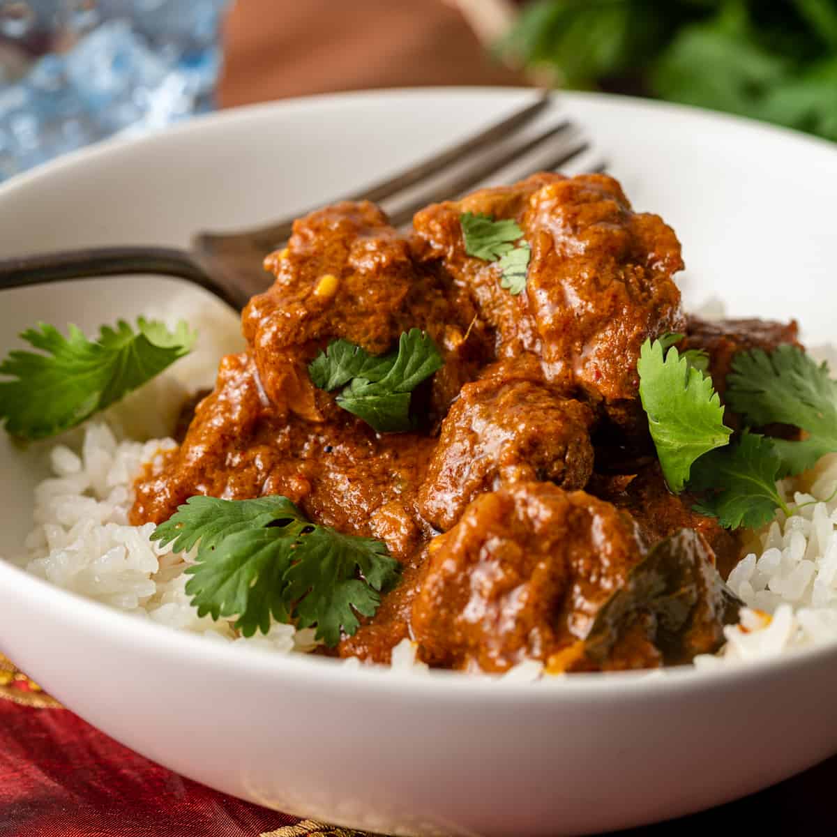 Un plat audacieux venu de Goa, réputé pour son piquant intense. L’agneau est mariné puis mijoté dans une sauce riche à base de piments, vinaigre, ail et épices aromatiques. La pointe d’acidité du vinaigre équilibre la chaleur des épices, offrant un goût puissant et profond. Idéal pour les amateurs de plats relevés, à savourer avec du riz basmati ou un naan pour adoucir le feu des saveurs.